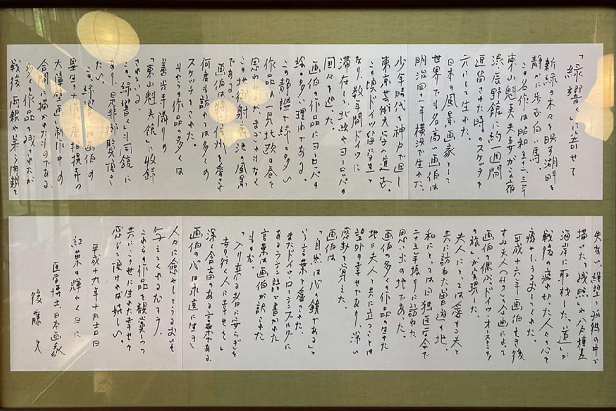The renowned Japanese painter Higashiyama Kaii once stayed here and left a handwritten message expressing his admiration for the peaceful atmosphere of the inn and its surroundings.